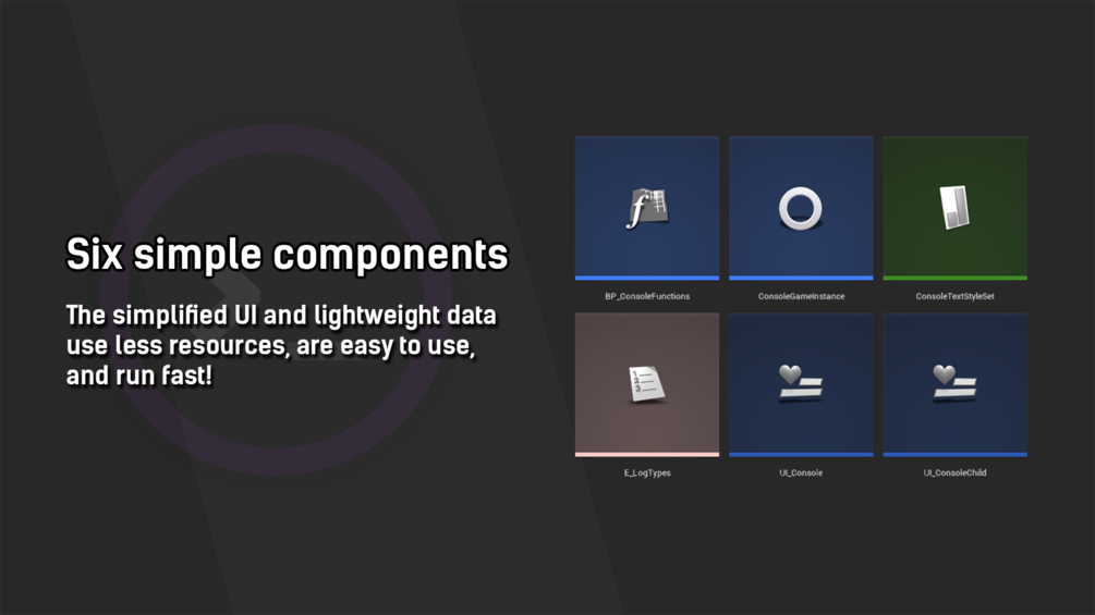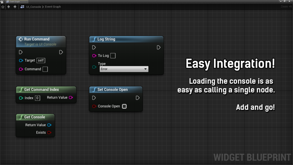 The Custom Console system is a lightweight, easy to use development console that is designed to be exposed to players. Being just a simple widget, this in-game development console allows developers to create callable functions that players can use to manipulate gameplay.