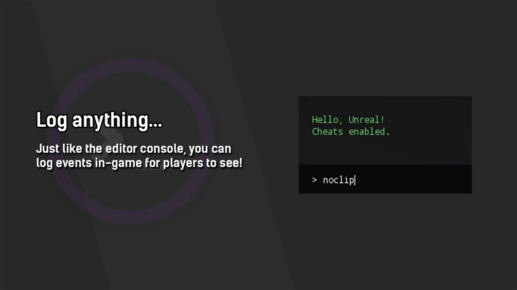 Some use cases for this system are for extensive game testing, allowing some kind of "cheat" system, or for viewing development specific errors that players can see in a shipping build, which may allow them to help you solve gameplay bugs or more!